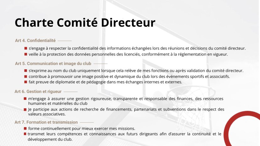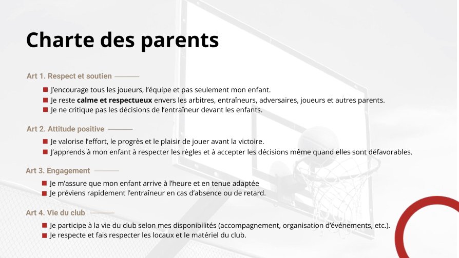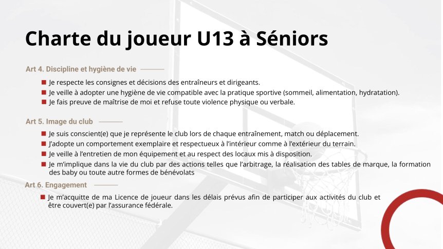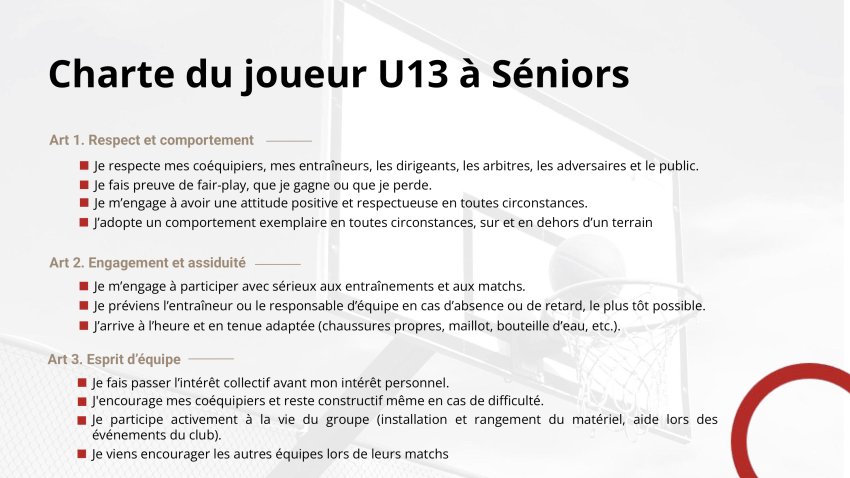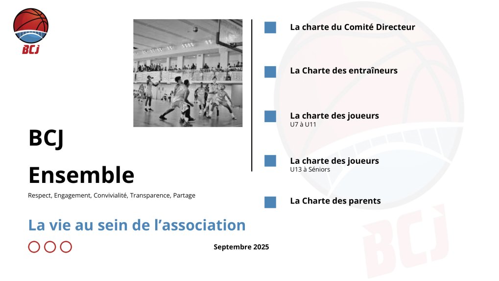 La Charte d'engagement de tous les adhérentes et adhérents (Comité Directeur, Entraîneurs, Joueuses & Joueurs, parents) est un document fondateur et fédérateur de notre association qui a décidé le 20 juin 2025 de donner une nouvelle dynamique à son fonctionnement et développement. En rejoignant le club du BCJ, vous vous engagez à respecter les principes fondamentaux de cette charte.